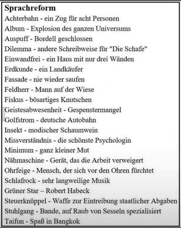 Fritzchen: "Papa, was ist eine Oper?" Vater: "Das ist, wenn jemand ein Messer in den Rücken bekommt, und anstatt zu sterben, anfängt zu singen." |