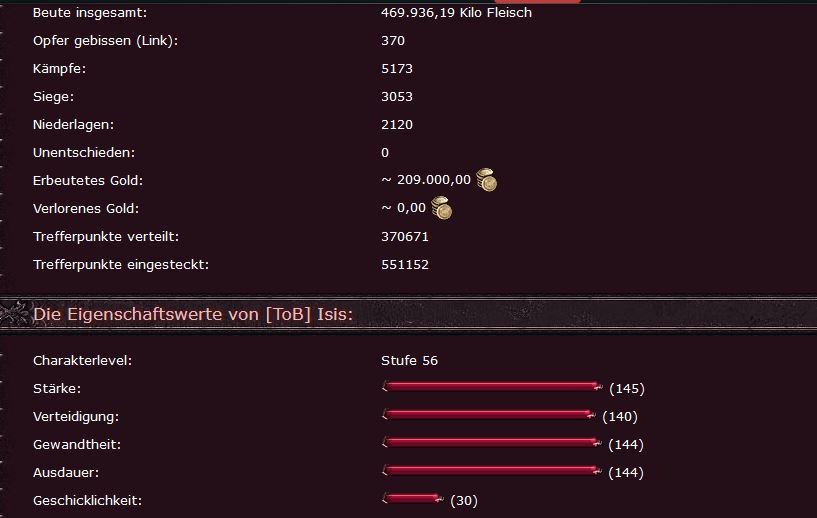 Die Skillung ist überwiegend entstanden durch Friedhof (keine Skillungen durch Käufe). Auch an den wenigen Beutezügen für ihr Level ersichtlich. Isi hat noch kein hohes Level seit der Erstellung dieses Charakters. Einerseits aus Zeitmangel, aber auch durch Angriffe, wodurch ich mehr offline war, als das ich anfangs Lust zu spielen hatte. Und das ist ja eigentlich nicht Sinn und Zweck dieses Spieles, offline zu bleiben. Erklärt aber auch die sehr vielen Serverleichen auf diesen Server, wenn sie es genauso handhaben, aber es dann im Unterschied zu mir auch bleiben.^^. Mittlerweile ist mein Wölfchen aber selbst ein guter Jäger geworden :) |