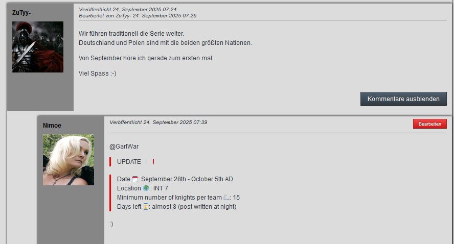 Spear shall be shakenπͺ ,shield shall be splinteredπ‘οΈ! Let this fragment be the slogan π£ of the first great war on the newest server β INT 7 π . βοΈ Battle of the NationsβοΈ : **POLAND π΅π± vs. GERMANY π©πͺ ** On August 29th AD 2025 launches new serwer. As players from Poland, we invite you β our friends from Germany π€ β to join us on the new server, and continuing a tradition that dates back over 13 years π . Polish vs German war is nothing new in the world of KnightFight. Such wars have been taking place for over a decade π¨βπ©βπ¦ To remind you gloryπ‘of the old days π of KnightFight , I'd like to draw your attention to Anno Domino 2012 π and arguably the biggest PL vs GER war: π― over 80 knights π₯ from Poland Can you imagine such a battle nowadays π€ͺ π Memorabilia ποΈ from this war can be found on the private Polish KF Wikipedia (data, numbers, list of fighters, posts from year 2012): The latest proposal for a Polish vs. German war was submitted by the German side 1.5 years ago, at the beginning of the INT 6 server launch. As we know, this event was not a success π₯ No one consulted this event with the Polish side beforehand. The "PL" guild (probably made by German players) suddenly appeared on INT 6 and no one of polish players knew what was going on. After 3 weeks of this strange situation, the Polish side asked the German side about their plans and simultaneously proposed a help in organization. Unfortunately, at that point (4 weeks after the server launched), the German side was no longer interested in a PL vs. GER war. Regardless of the above, the Polish side expresses respect π«‘ and appreciation π to the German π©πͺ side π€ for taking the initiative βοΈ. Over 1 year ago the initiative came from the GER side. This year, we want to reverse the order. This time, Polish side issues the challenge. We present you with two naked swords βοΈ . May they inspire you to fight. Let's do it together π€ . This year, we have plenty of time. There are still almost 40 days until the war. TECHNICAL DETAILSπ¨βπ§ π§ Our proposal is as follows πͺΆ : β‘οΈ 1. The war will begin 30 days ποΈ after the server launch, probably 28th September - 5th October AD 2025. β‘οΈ 2. Each team will have a minimum of 10 players βοΈ . PL - 10, GER - 10. We believe that wars with fewer than 10 players are pointless, as this is a war where one person decides the outcome. The more players, the more fair is a result. β‘οΈ 3. Each team (PL and GER) operates autonomously π³οΈ , meaning that the selection of team members is a completely internal matter. β‘οΈ 4. Each team will appoint a captain π , who, if necessary, will contact the opposing team captain regarding current matters. We want to ensure a line of communication π¨ . β‘οΈ 5. The Polish side will declare war πββοΈ as the initiator of the event . There may be questions about whether other players can participate. The answer is: each team operates autonomously. If the PL or GER team captain agrees to accept you into their own team, you are welcome. The goal of the event is to have fun and enjoy the game together π βοΈ πͺ If anyone is already interested in participating, please comment which team you'd like to be a part of by # [PL] or [GER]. This event is a initiative by a group of players from Poland. For now, we can tell you that WALDAN π will be the captain of the Polish team. First and foremost, we're asking for feedback from our friends from Germany. This year, we have plenty of time to organize a war β almost 40 days left until the planned event. Let's do it together. If there are enough participants, we might be able to organize a 15 vs. 15 war, or even a 20 vs. 20 war π I hope see you on the battle field! βοΈ |