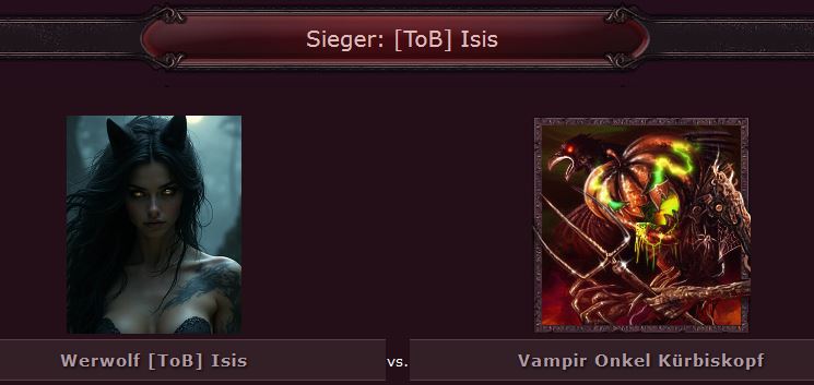 Kampfbericht im Detail am 06.11.2025 um 14:26:08 Uhr Name:Trefferpunkte:Lebensenergie:Vampir Pb8-ZX98777435Werwolf Onkel Kürbiskopf54576993Sieger: Pb8-ZX |