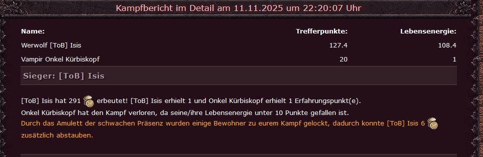 Kampfbericht im Detail am 07.11.2025 um 16:01:29 Uhr [NH] Syrana hat 1.114 Gold erbeutet! [NH] Syrana erhielt 1 und Onkel Kürbiskopf erhielt 1 Erfahrungspunkt(e). |